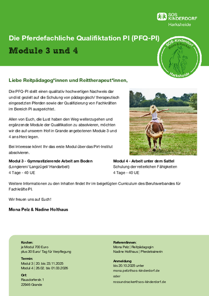 Gute Nachrichten! Die Module 3 und 4 der Pferdefachlichen Qualifikation des Berufsverbands PI werden ab November auch in Norddeutschland (Standort Grande) angeboten.