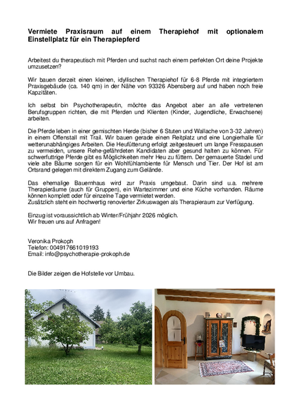 Auf einem einem kleinen, idyllischen Therapiehof für 6-8 Pferde mit integriertem Praxisgebäude (ca. 140 qm) in der Nähe von 93326 Abensberg sind noch freie Kapazitäten vorhanden. Die Pferde leben in einer gemischten Herde (bisher 6 Stuten und Wallache von 3-32 Jahren) in einem Offenstall mit Trail. Ein Reitplatz und eine Longierhalle für wetterunabhängiges Arbeiten sind im Bau. Das ehemalige Bauernhaus wird zur Praxis umgebaut. Darin sind u.a. mehrere Therapieräume (auch für Gruppen), ein Wartezimmer und eine Küche vorhanden. Die Räume können komplett oder für einzelne Tage vermietet werden.