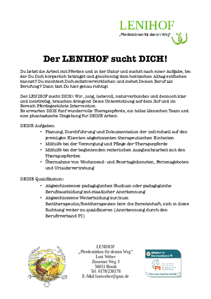 Das junge, naturverbunde Team vom Lenihof in der Eifel sucht Unterstützung auf dem Hof und im Bereich Pferdegestützte Intervention. Mehr Details findet ihr in der Stellenausschreibung.