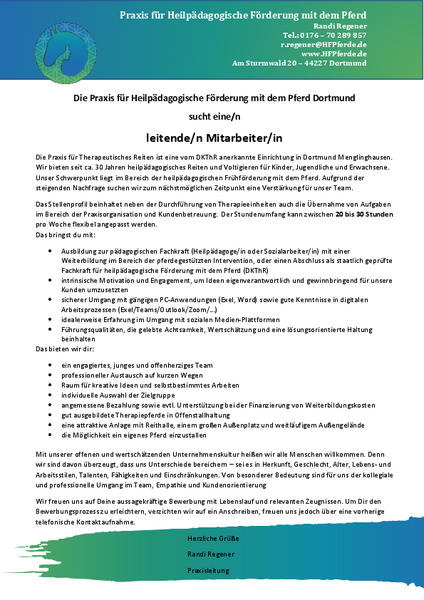 Das Stellenprofil beinhaltet neben der Durchführung von Therapieeinheiten auch die Übernahme von Aufgaben im Bereich der Praxisorganisation und Kundenbetreuung. Der Stundenumfang kann zwischen 20 bis 30 Stunden pro Woche flexibel angepasst werden.
