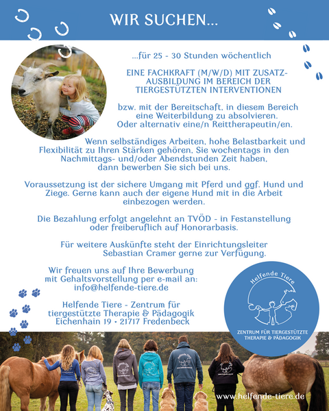 Das Zentrum für Tiergestützte Therapie und Pädagogik "Helfende Hände" in Fredenbeck/ Niedersachsen sucht zum nächstmöglichen Zeitpunkt eine Fachkraft mit Zusatzausbildung im Bereich der Tiergestützten Interventionen für 25 bis 30 Stunden wöchentlich. Alternativ ist auch eine Qualifikation als Reittherapeut/in möglich oder die Bereitschaft, in diesen Bereichen eine Weiterbildung zu absolvieren. Nähere Infos findet ihr im pdf.