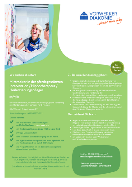 Die Vorwerker Diakonie in Lübeck sucht für die Reithalle eine/n Mitarbeiter/in aus dem sozialen/ therapeutischen Bereich. Die Stelle umfasst 30 Stunden und ist zunächst auf 6 Monate befristet. Mehr Details zu Leistungen der Diakonie und Voraussetzungen für Bewerber findet ihr im pdf.