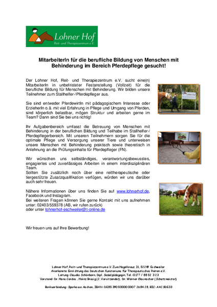 Der Lohner Hof, Reit- und Therapiezentrum e.V. sucht eine(n) MitarbeiterIn in unbefristeter Festanstellung (Vollzeit) für die berufliche Bildung für Menschen mit Behinderung.