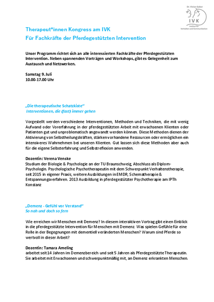 Unser Mitgliedinstitut IVK bietet am 9. und 10 Juli 2022 einen Therapeut*innen Kongress an. Das Programm richtet sich an alle interessierten Fachkräfte der Pferdegestützten Intervention. Neben spannenden Vorträgen und Workshops, gibt es Gelegenheit zum Austausch und Netzwerken. Die Kosten betragen 260,-Euro (inkl. Kaffee, Tee, Getränke und Knabbereien). Anmeldungen bitte unter info@horseability.de.